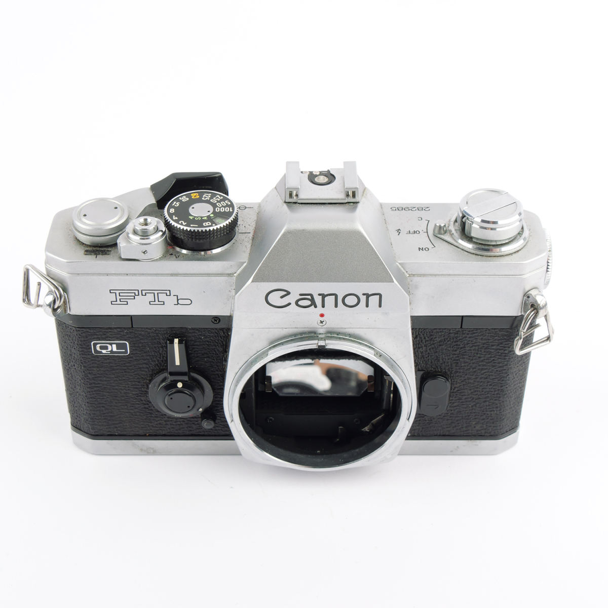 Die Canon FTb wurde Anfang der 1970er Jahre vorgestellt und gilt als robuste, vollmechanische Spiegelreflexkamera aus der klassischen FD-Ära. Sie war bei Amateur- und Semiprofi-Fotografen beliebt und bot eine zuverlässige Belichtungsmessung sowie ein widerstandsfähiges Metallgehäuse. Dieses Exemplar befindet sich im altersüblichen Zustand mit sichtbaren Gebrauchsspuren.