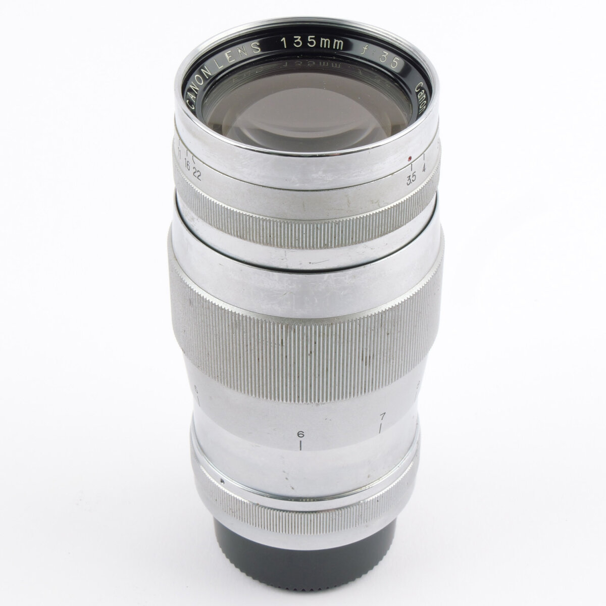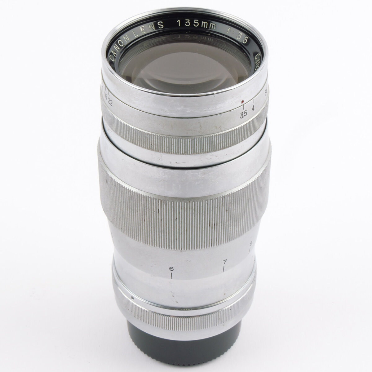A Canon 135mm f/3.5 LTM lens in used, untested condition with a stiff aperture mechanism and unknown optical and mechanical state. Suitable for parts, servicing, or collector interest. Sold strictly as-is.