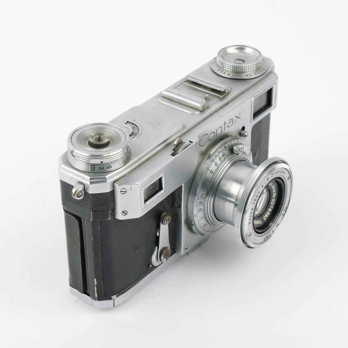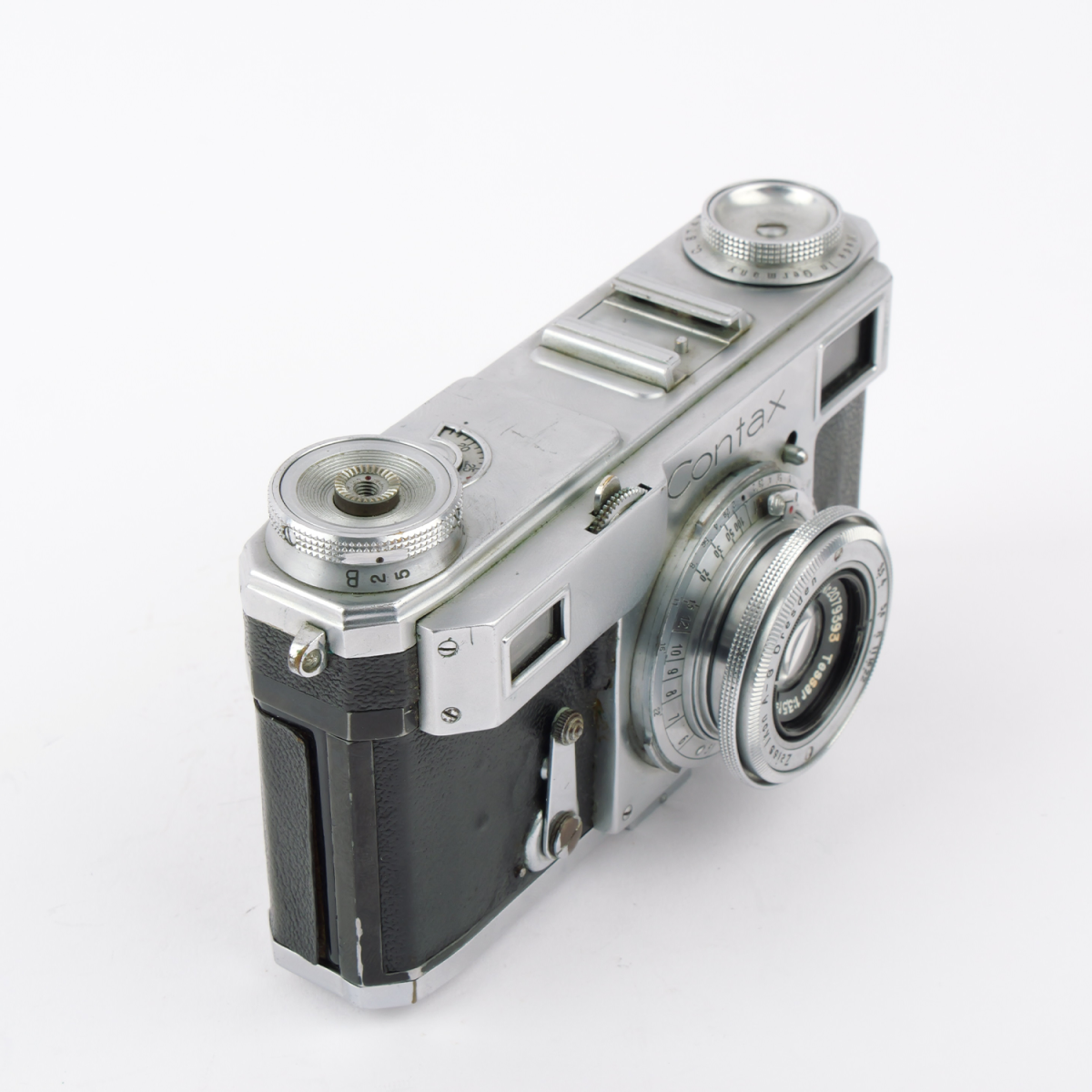This version comes fitted with the Carl Zeiss Tessar 3.5/50mm, a renowned standard lens known for its superb sharpness, contrast, and timeless optical rendering. The combination of Contax precision and Zeiss optics makes this camera an outstanding example of photographic excellence.