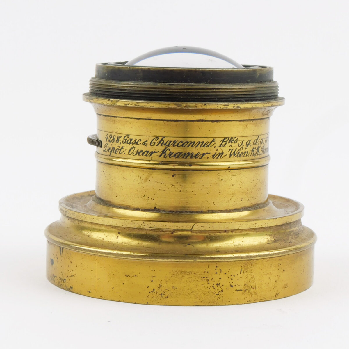 Ein außergewöhnlich seltenes Gasc & Charconnet „Globe“-Weitwinkelobjektiv in solider Erhaltung für sein Alter. Ideal für Sammler, Wet-Plate-Anwender oder zur musealen Präsentation – eine hervorragende Gelegenheit für Liebhaber früher fotografischer Optikgeschichte.