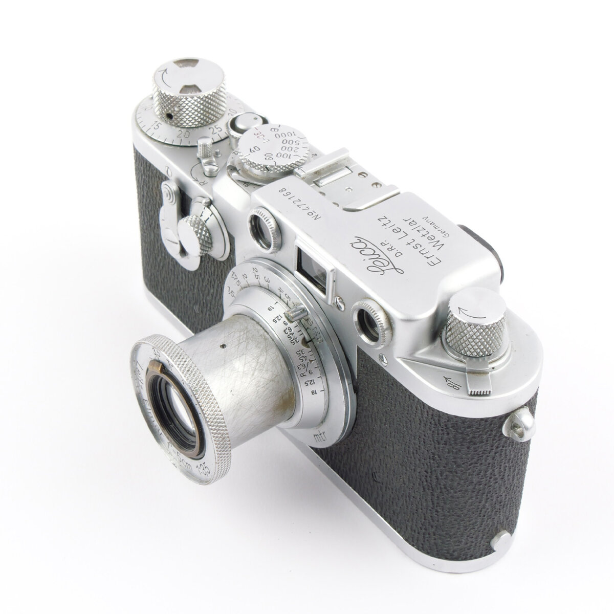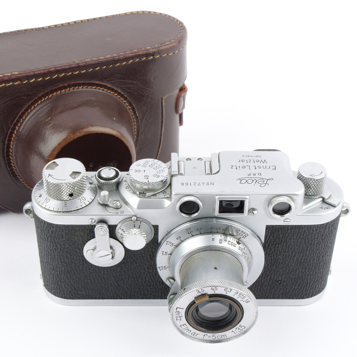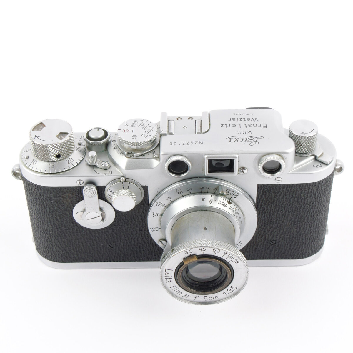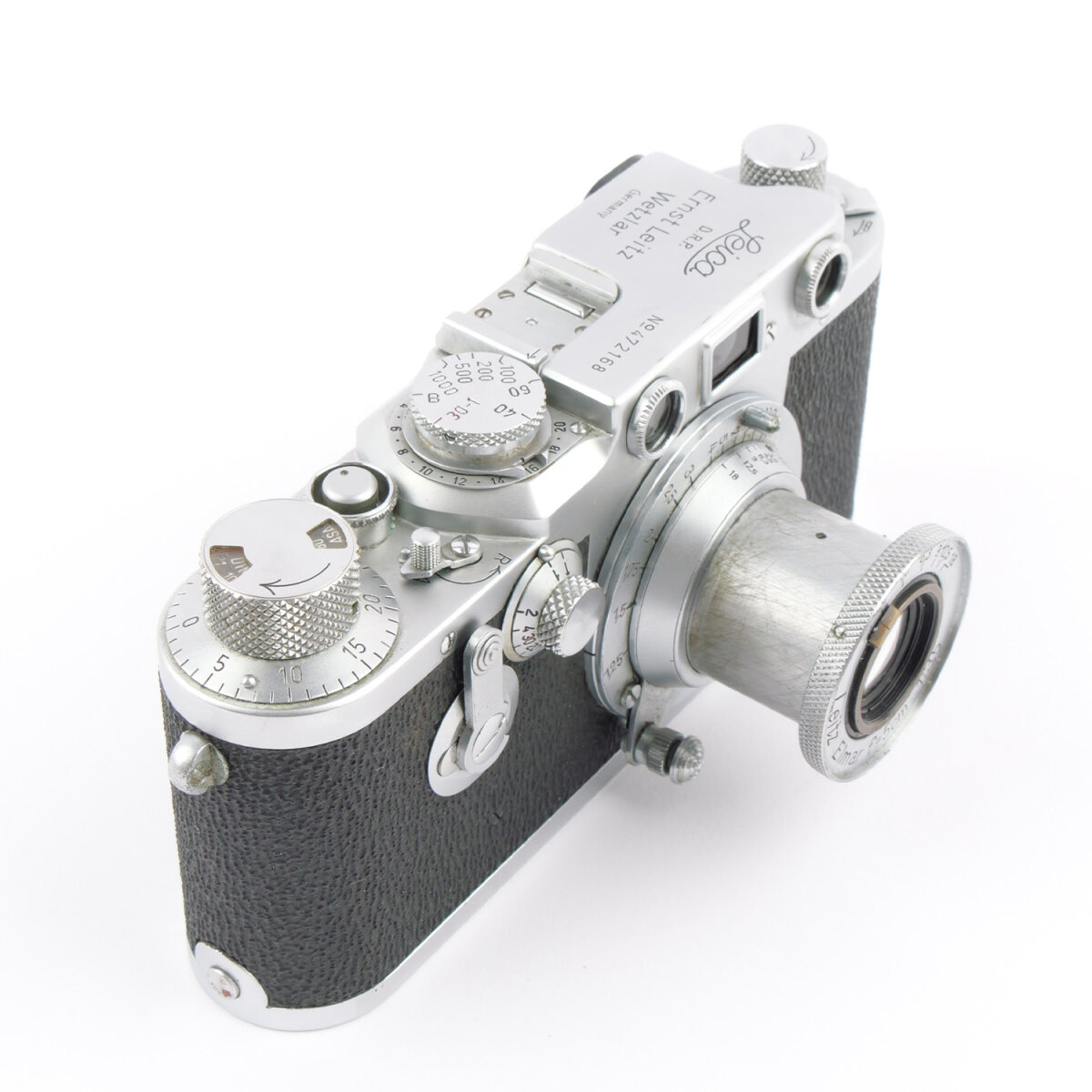 Besondere Leica IIIc in sogenannter „Sharkskin“-Ausführung mit IIIF-ähnlichem Umbau und Selbstauslöser, kombiniert mit dem klassischen Elmar 5cm f/3.5 Objektiv. Eine seltene und interessante Konfiguration innerhalb der Leica Schraubmodelle.