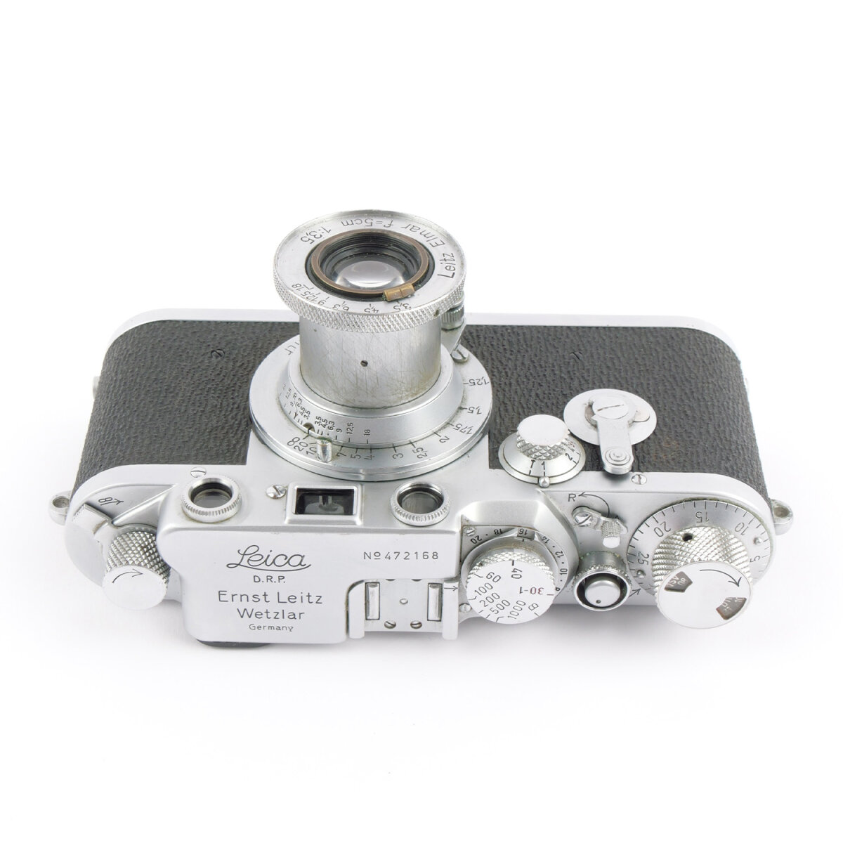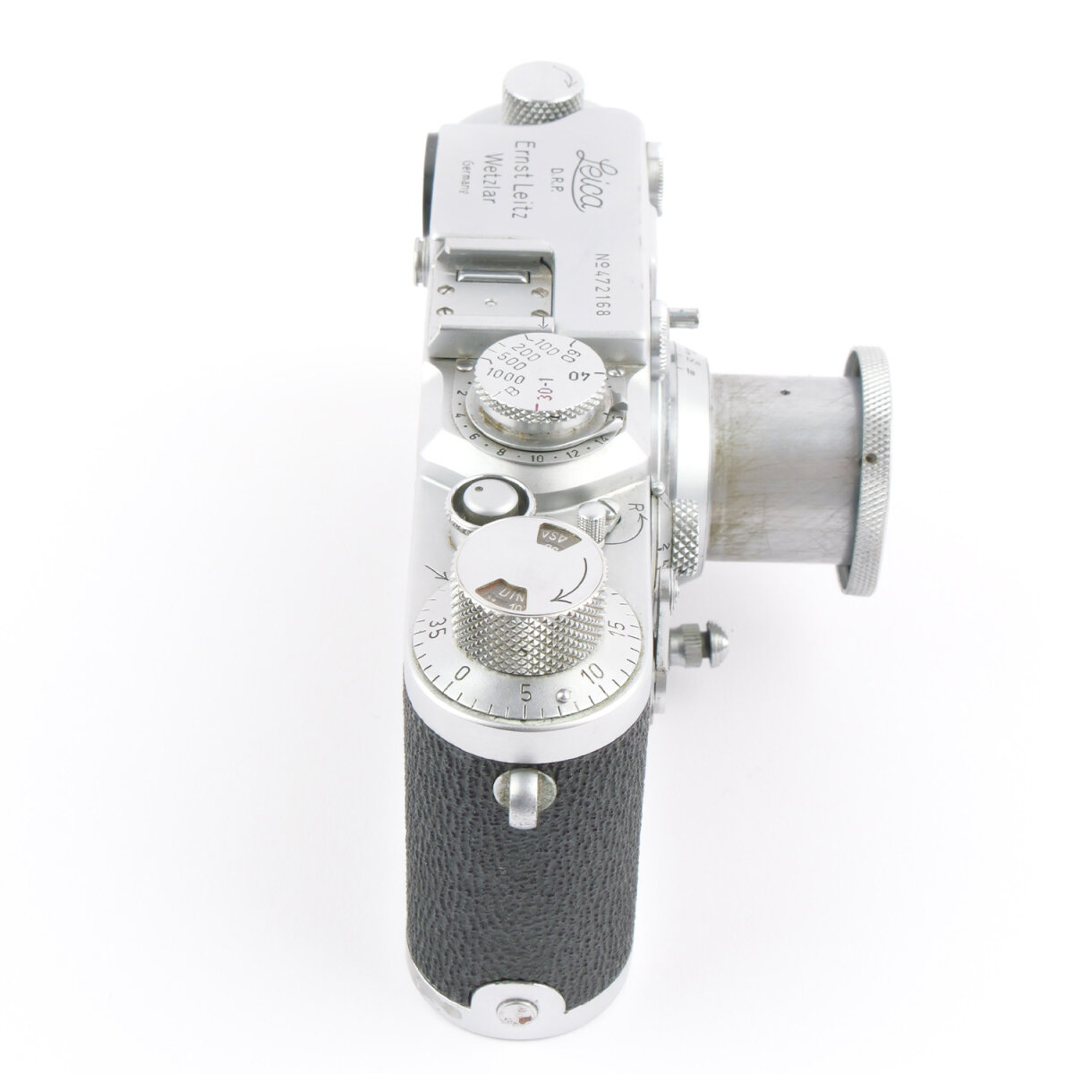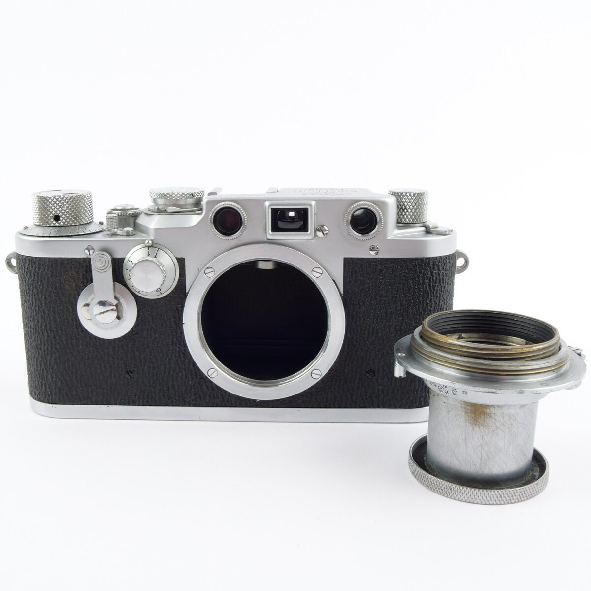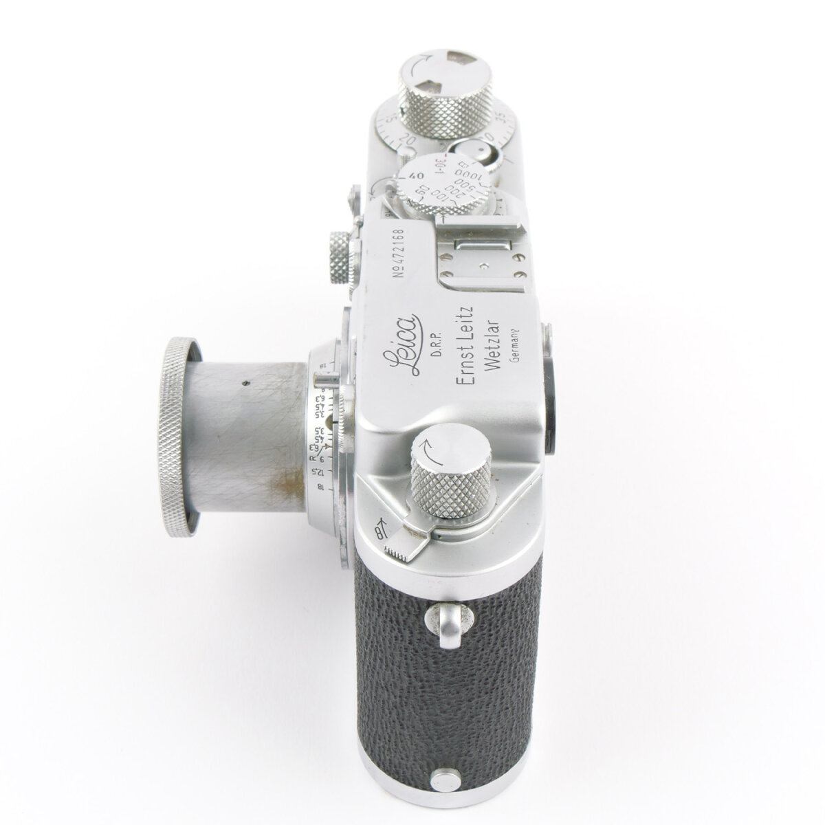 Besondere Leica IIIc in sogenannter „Sharkskin“-Ausführung mit IIIF-ähnlichem Umbau und Selbstauslöser, kombiniert mit dem klassischen Elmar 5cm f/3.5 Objektiv. Eine seltene und interessante Konfiguration innerhalb der Leica Schraubmodelle.