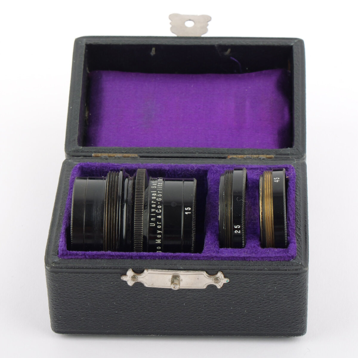 This Meyer Görlitz Universal Satz 1 is an exceptionally rare, complete lens set offered in mint, collector-grade condition. It includes the base optical unit along with two interchangeable front elements (25mm and 45mm), all stored in the original fitted case, which is itself in excellent shape. Sets this complete and pristine are seldom encountered and highly desirable among collectors of historical optics.