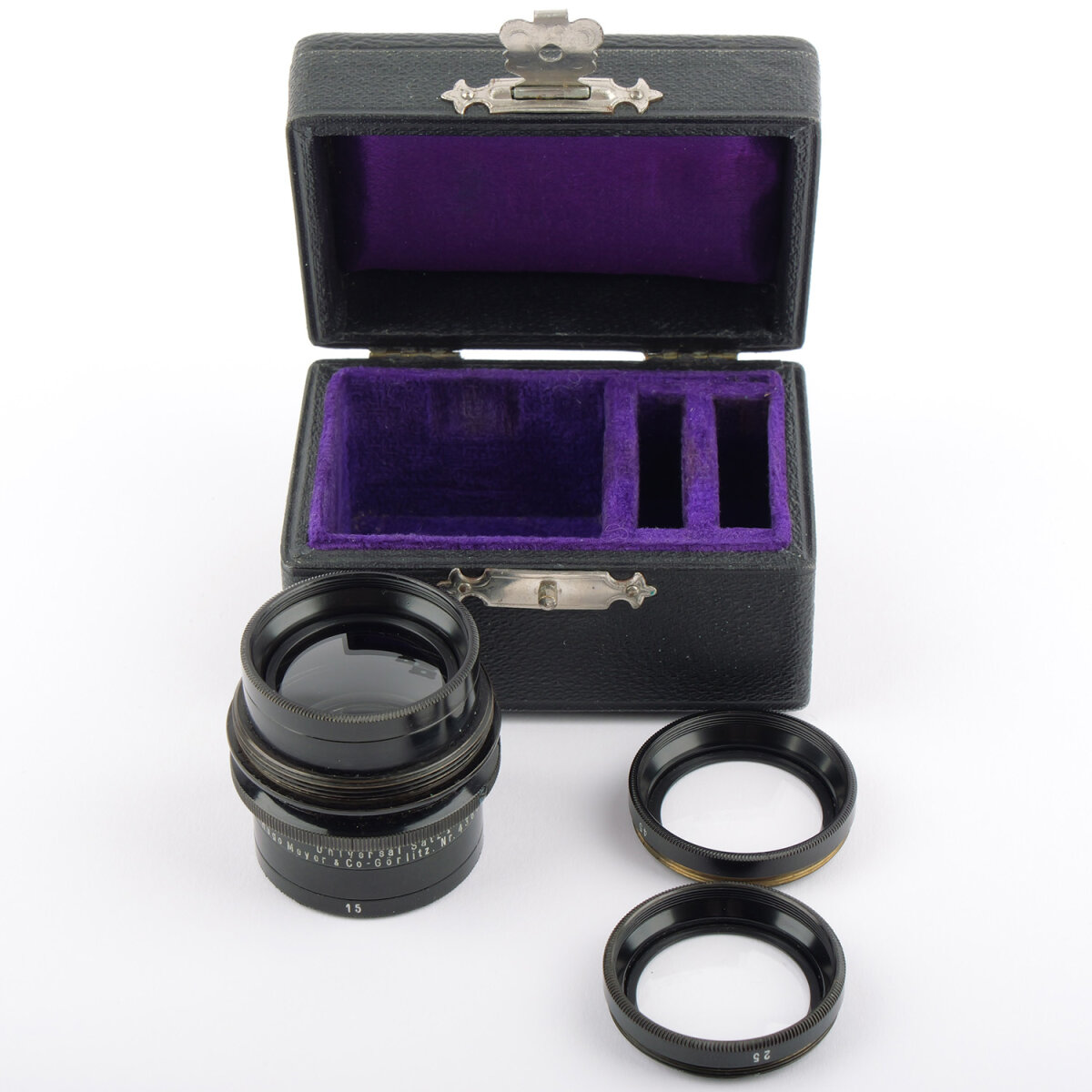 An exceptionally well-preserved, complete Meyer Görlitz Universal Satz 1 set, including its 25mm and 45mm elements and original presentation case. A rare opportunity for serious collectors or users of historical view camera systems to acquire a mint, optically pristine example of this sought-after modular lens set.