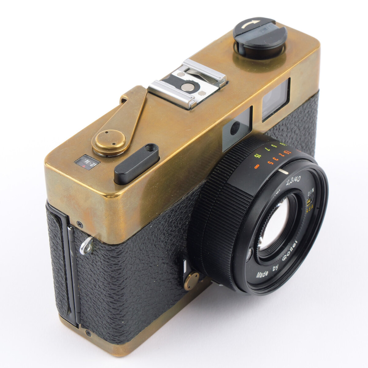 The Rollei XF 35 has been extensively customized in a brass look. The original paint appears to have been removed, revealing the brass finish and giving the camera a consistent and distinctive design down to the last detail.